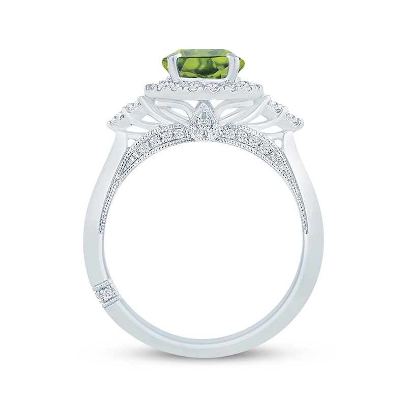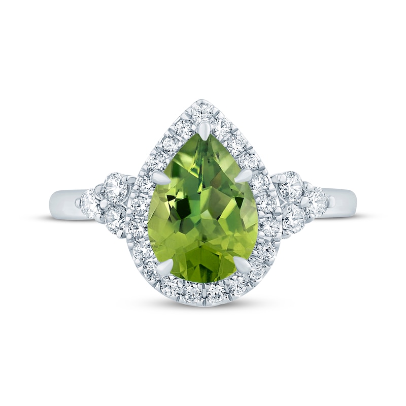 Embrace the joyous spirit of exuberant hues in this gemstone and diamond engagement ring. The stunning look is crafted in 14K white gold. At its center, an impressive pear-shaped peridot is wrapped in a frame of round-cut diamonds. Trios of round diamonds flank the centerpiece, creating a sparkling design. More round diamonds and intricate milgrain detailing decorate the bridge. A signature element of diamonds in milgrain detailing encircles the band, symbolizing unity and eternal love. The style has a total diamond weight of 1/2 carat. From the Monique Lhuillier Bliss collection, available exclusively at KAY. Please note: This ring is available in limited sizes. If you don't see your size here, please visit a store to order your ring.