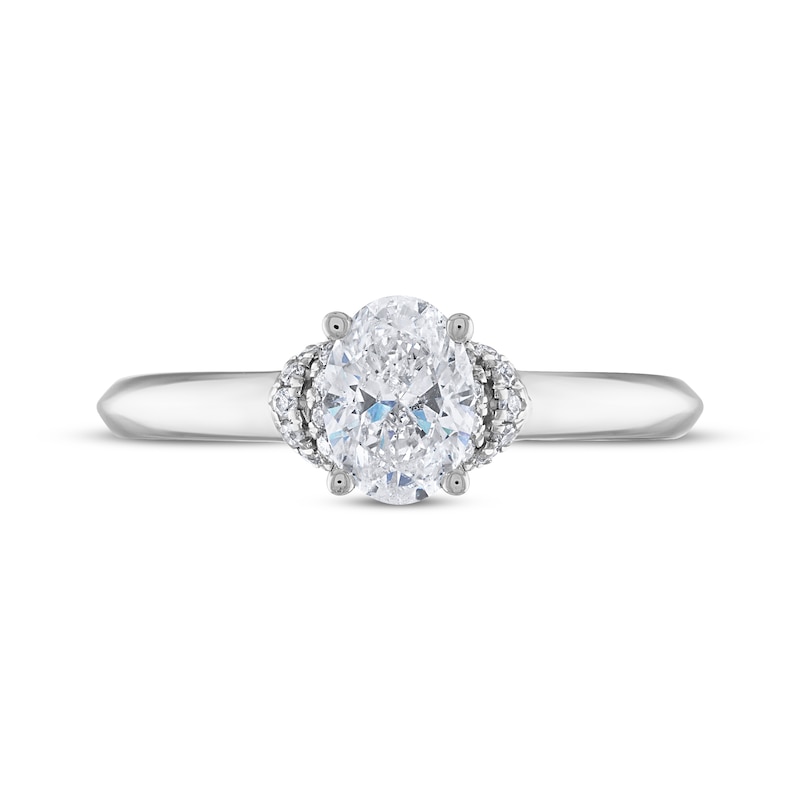 This captivating engagement ring displays a luminous 1/2-carat oval-cut diamond. A double-collar of radiant round diamonds drapes around the base of the center stone. This dazzling ring is crafted in iconic 14K white gold and has a total diamond weight of 5/8 carat.